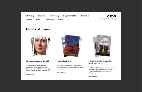Link: cms-basel.chSeit 2020 unterstützen wir die Christoph Merian Stiftung dabei, ihre digitale Strategie neu auszurichten, die Informationsarchitektur der Website zu optimieren, den Förderantragsprozess digital zu denken und haben die neue Stiftungswebseite sowie die digitale Version vom Stiftungsmagazin «Radar» entwickelt.